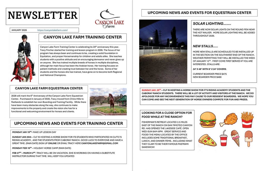 Please click here for all the latest news and upcoming events at CLF Equestrian Center!