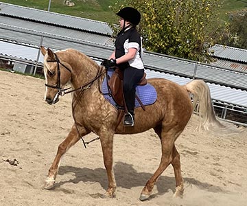 Gemma is a beautiful Half-Arabian that moves out willingly and is quickly teaching our intermediate riders how to handle a finer-tuned horse. She was a blue ribbon winner in her local show debut with one of our young walk-trot riders!